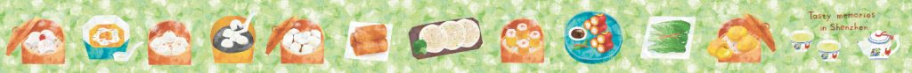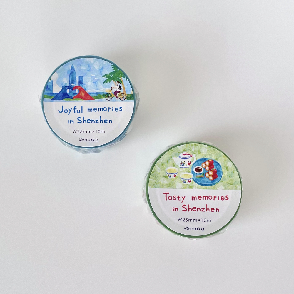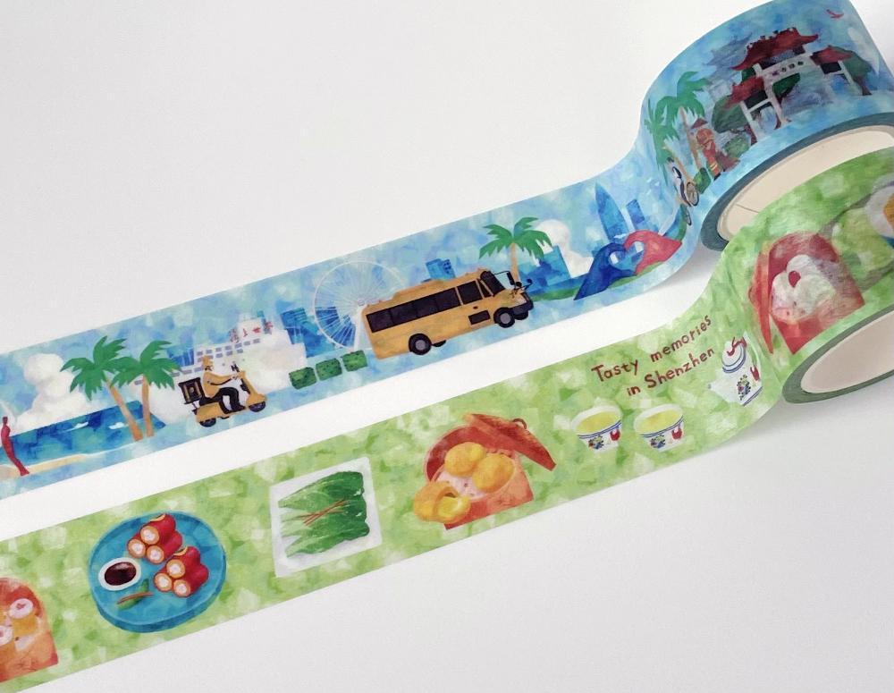 深センの街並みを描いた「Joyful memories in Shenzhen」と深センでポピュラーな飲茶を描いた「Tasty memories in Shenzhen」2種類のマスキングテープを作りました。